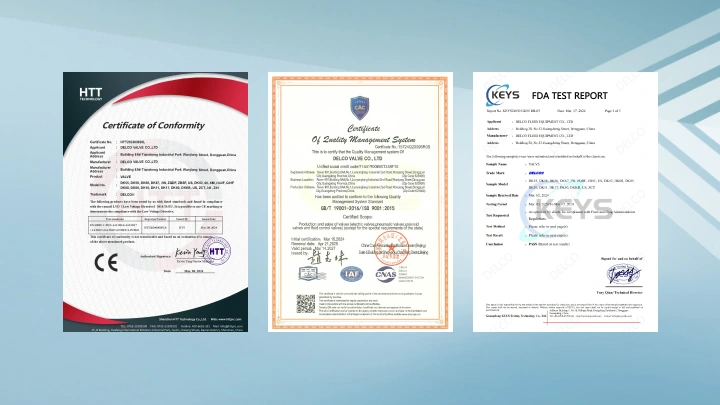 Nous avons été certifiés par ISO9001:2015, CE, SGS, ROHS, TUV, FDA et a gagné plus que 30 Brevets pour prouver notre professionnalisme dans Valve déposés. DELCO suit strictement le système de gestion de la qualité ISO9001 et a réussi la certification de sécurité CE, Certification environnementale ROHS, Certification internationale SGS et sécurité alimentaire FDA, ainsi que plusieurs brevets clés pour garantir que chaque valve soit soumise à des tests de qualité stricts. Nous avons gagné la confiance de nombreux clients grâce à nos produits et services de haute qualité, et notre réputation est bien connue dans plus que 100 Pays du monde entier.