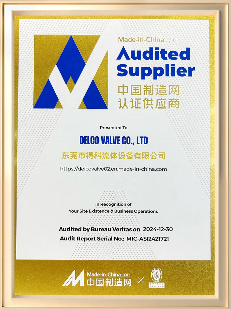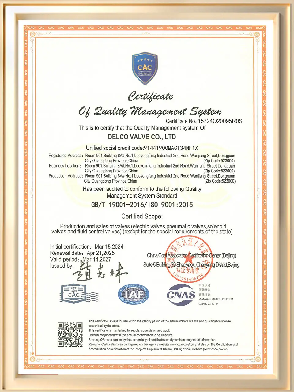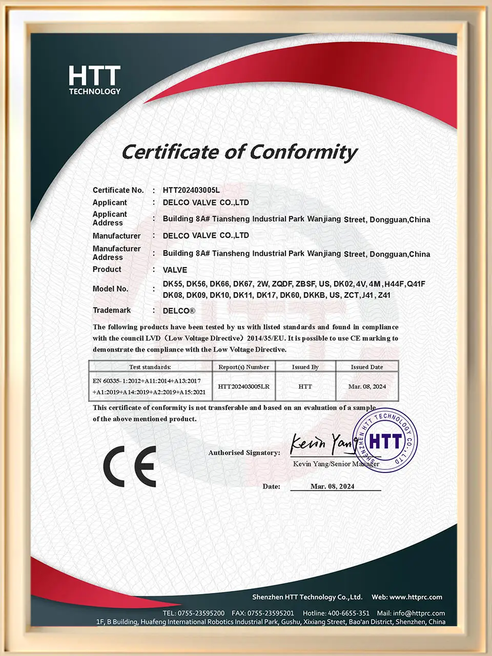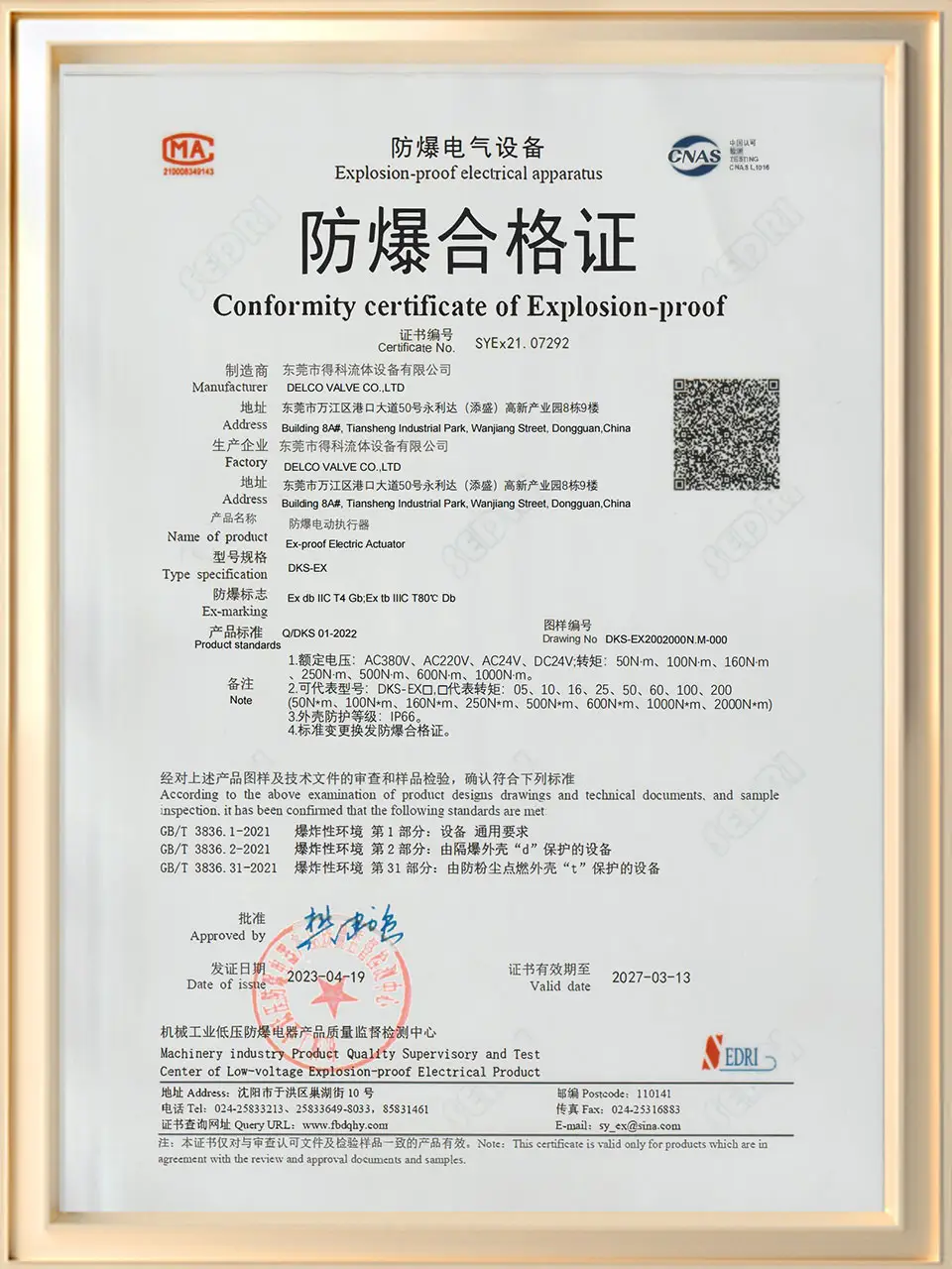 Les vannes et actionneurs Delco sont fabriqués sous un contrôle qualité strict et certifiés par ISO9001, CE, ATEX, et les normes RoHS.