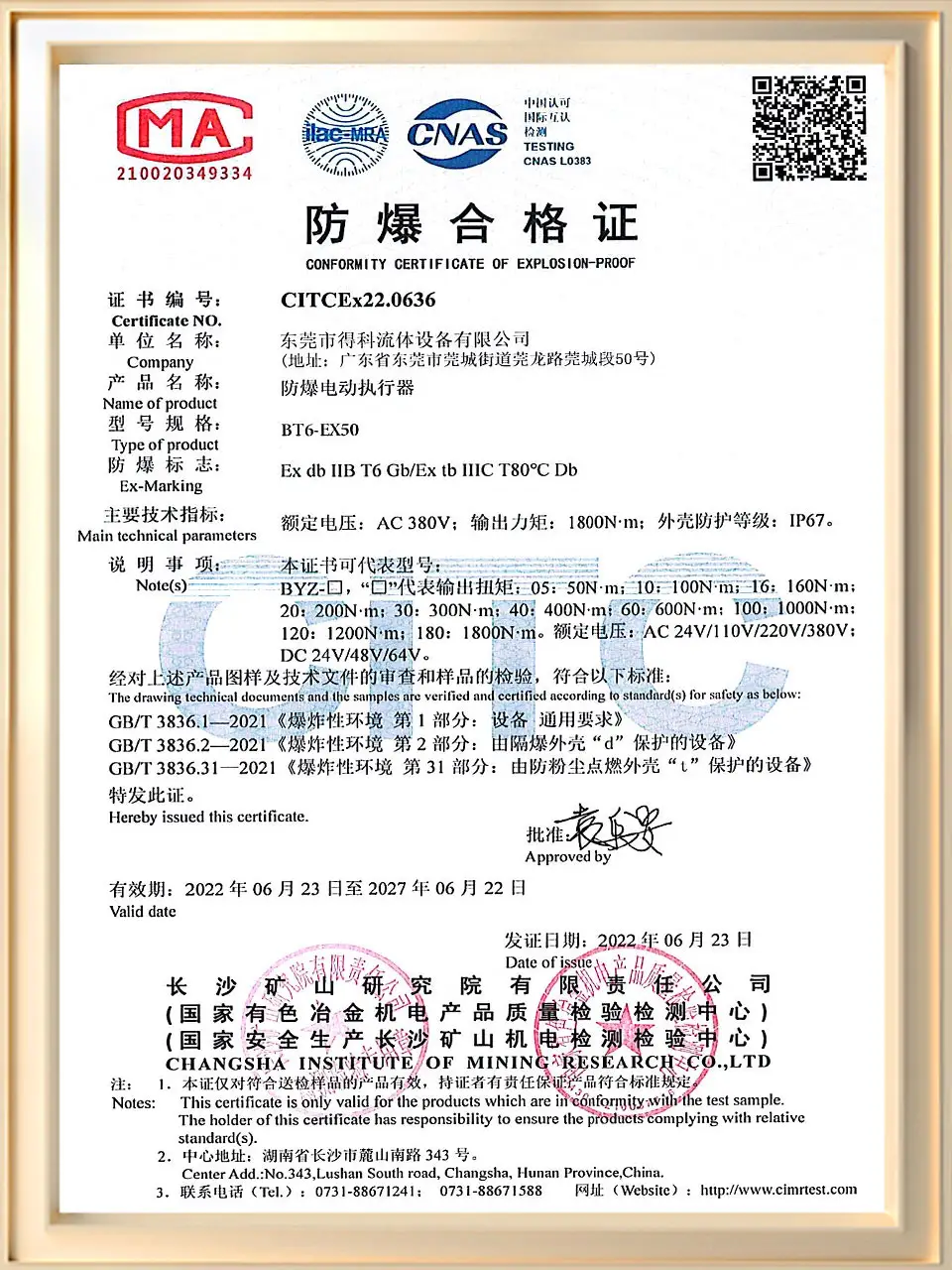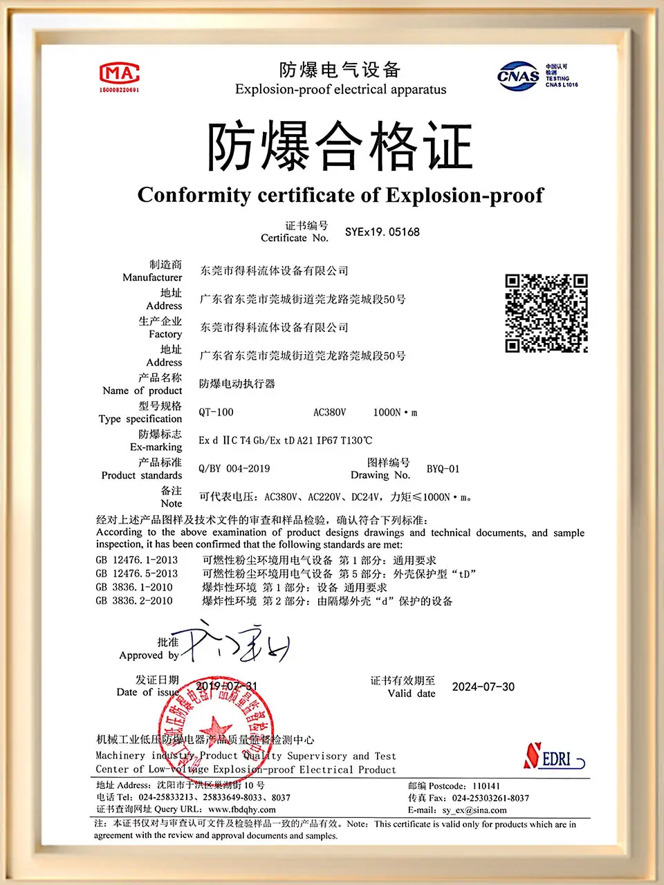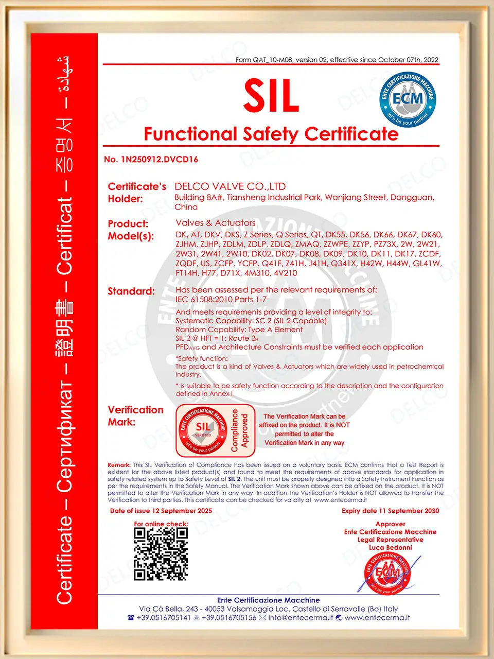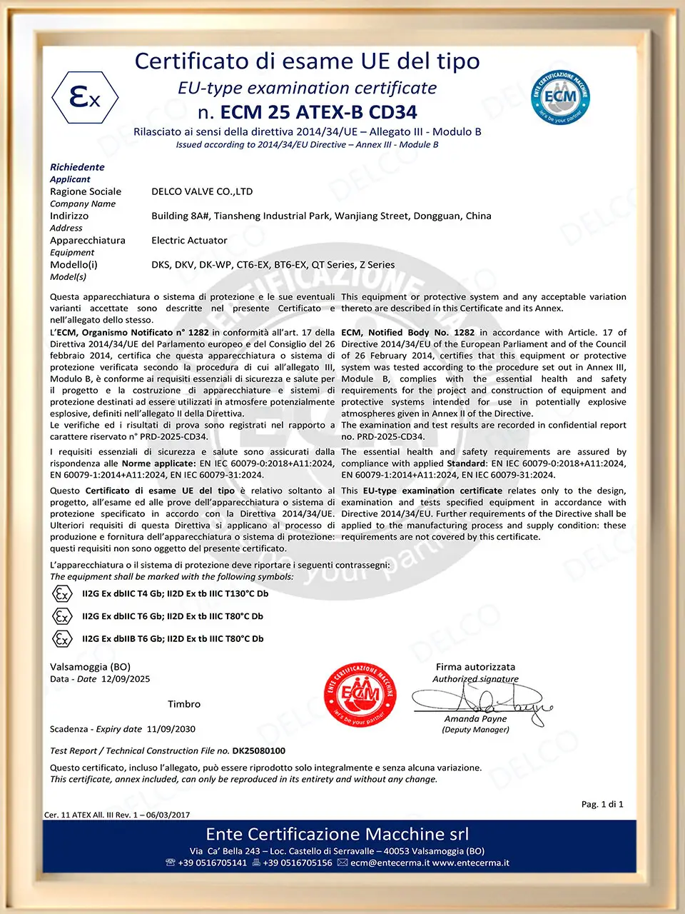 Les vannes et actionneurs Delco sont fabriqués sous un contrôle qualité strict et certifiés par ISO9001, CE, ATEX, et les normes RoHS.