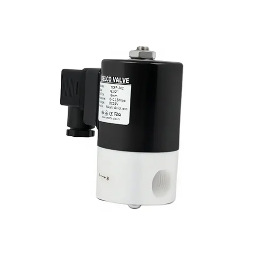 La série DELCO YCFP est une vanne électrovanne à action directe spécifiquement conçue pour des applications hautement corrosives. Doté d’un corps en PTFE et d’une structure diaphragme d’isolement, Il est résistant aux acides et alcalis forts. Il fonctionne efficacement à pression nulle (0,00 MPa) jusqu’à 0,15MPa,ce qui en fait un indispensable, composant à haute fiabilité pour un contrôle précis dans les procédés chimiques et les systèmes de dosage.