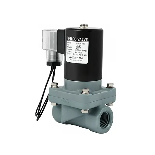 La série DELCO ZCFP est une électrovanne légèrement résistante à la corrosion avec un corps en plastique UPVC/CPVC, adaptée aux fluides doux et corrosifs, Y compris le sel, acide faible, et les solutions alcalines (Par exemple, Acide sulfurique <10 %). Disponible en jeu d’acteur direct (départ zéro) et types pilotés, Il offre un contrôle fiable et économique des fluides pour le traitement de l’eau et les applications chimiques légères.